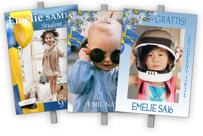 Nu är det snart dags att fira alla studenter! Hos oss kan du designa ditt eget personliga och unika studentplakat – i en av våra butiker eller här på vår hemsida. Studentskylten kan kompletteras med en studentförstoring, inbjudningskort, tackkort och andra dekorationer för studentfesten.